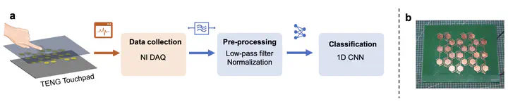 The development of the human-machine interface (HMI) is endeavored to find effective approaches to interact with machines by applying emerging technologies. Triboelectric nanogenerator (TENG) can convert mechanical stimuli to electricity, which not only shows great potential in sensing but also is widely used in various HMI applications. This paper proposed a TENGbased hexagonfractal touchpad (HTPad) system using two channels to realize 18 sliding patterns from 3 different modes and a signal recognition module. A onedimensional convolution neural network (1D CNN) model is proposed for the recognition of the sliding direction signal with 96.5% accuracy, and handwriting digit signals collected by the touchpad can be recognized with a modified model with 99% accuracy. The proposed TENGbased hexagonfractal touchpad is easy to fabricate, scalable, and with high sensitivity. Furthermore, the recognition model can serve as a unified platform for different recog.nition tasks with little computational cost, which reveals great potential in HMI applications.